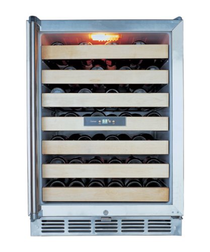 Vinotemp VT-52 Stainless Steel (52) Bottle Front venting wine cooler. New Vinotemp design. This beautiful cabinet has a stainless steel door, stainless steel cabinet, roll out wood and metal shelves, and a digital display. Front exhaust feature for building into existing structures. This is our top of the line of undercounter wine cellars. These are designed for inside the home installation. Not for garage or basement placement.